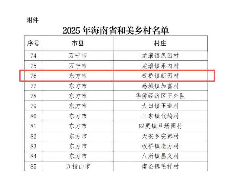 近日,海南省农业农村厅正式公布2025年海南省和美乡村名单,全省共200个行政村(社区、居)获此殊荣。其中,由开元官网乡村振兴定点帮扶对象—东方市板桥镇新园村成功入选,标志着该村在宜居宜业、乡风文明、治理有效等方面取得显著成效,也彰显了校地协同推进乡村振兴的实践成果。