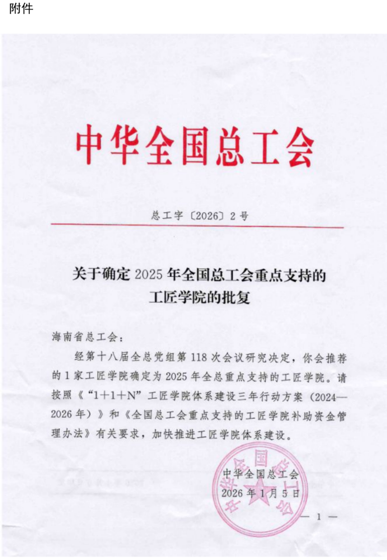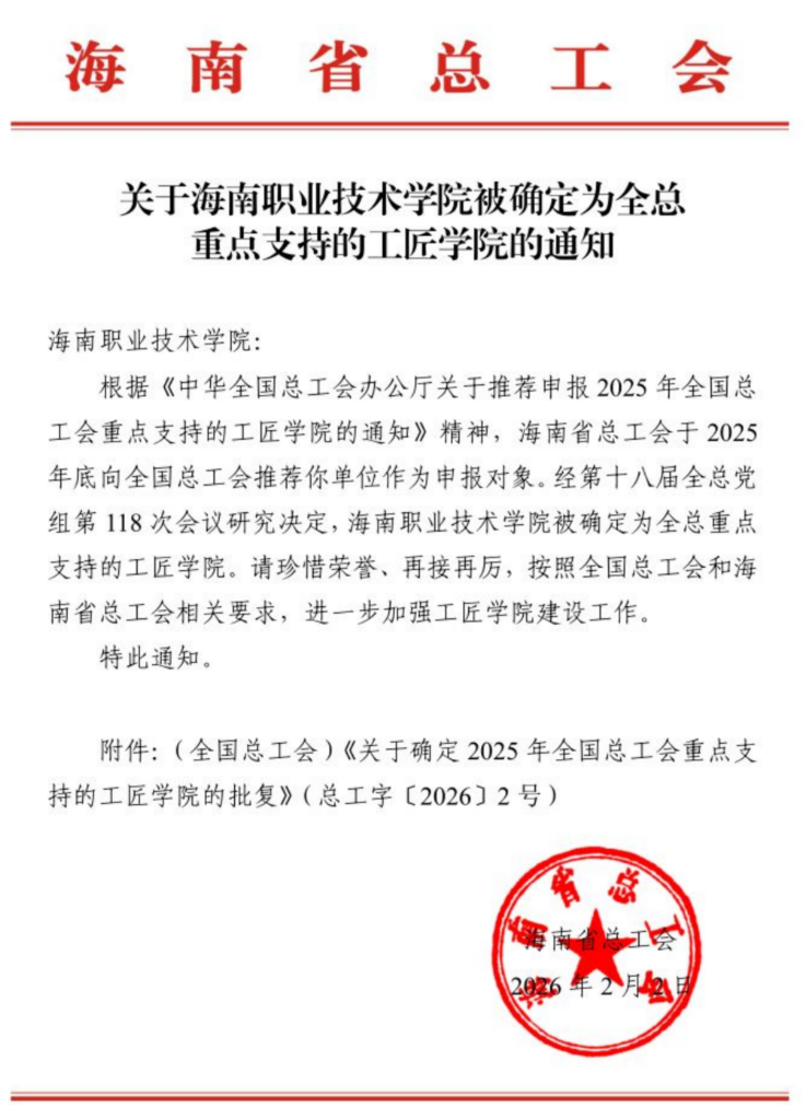 喜报!海职院被确定为全国总工会重点支持的工匠学院